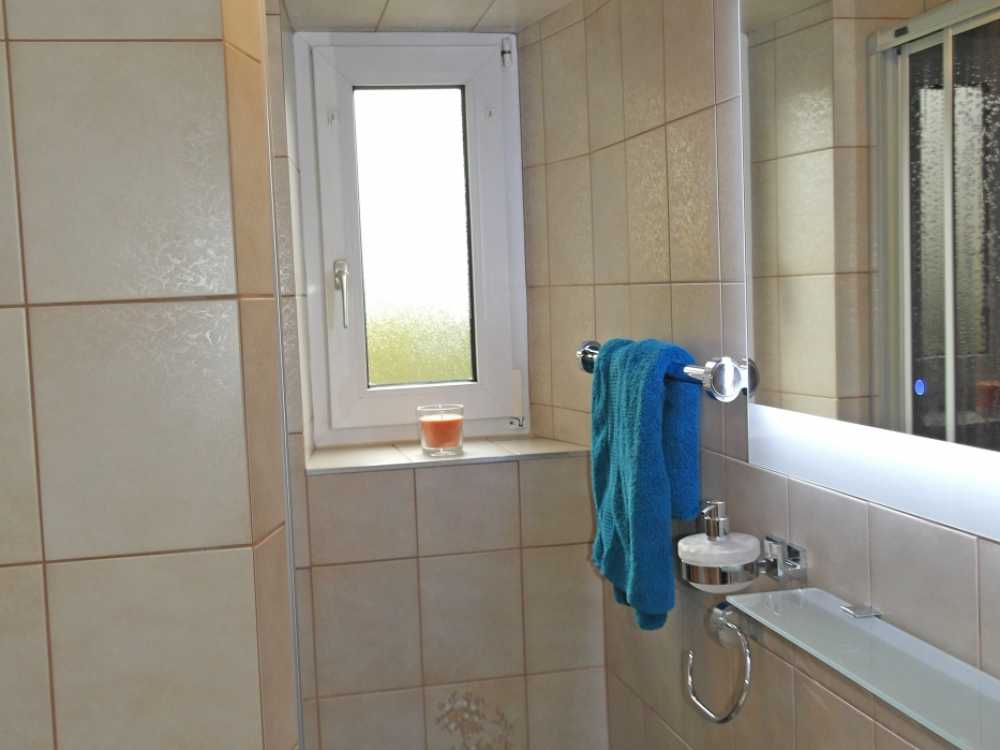 -Badezimmer mit WC, Dusche, Handtüchern und Fön,
