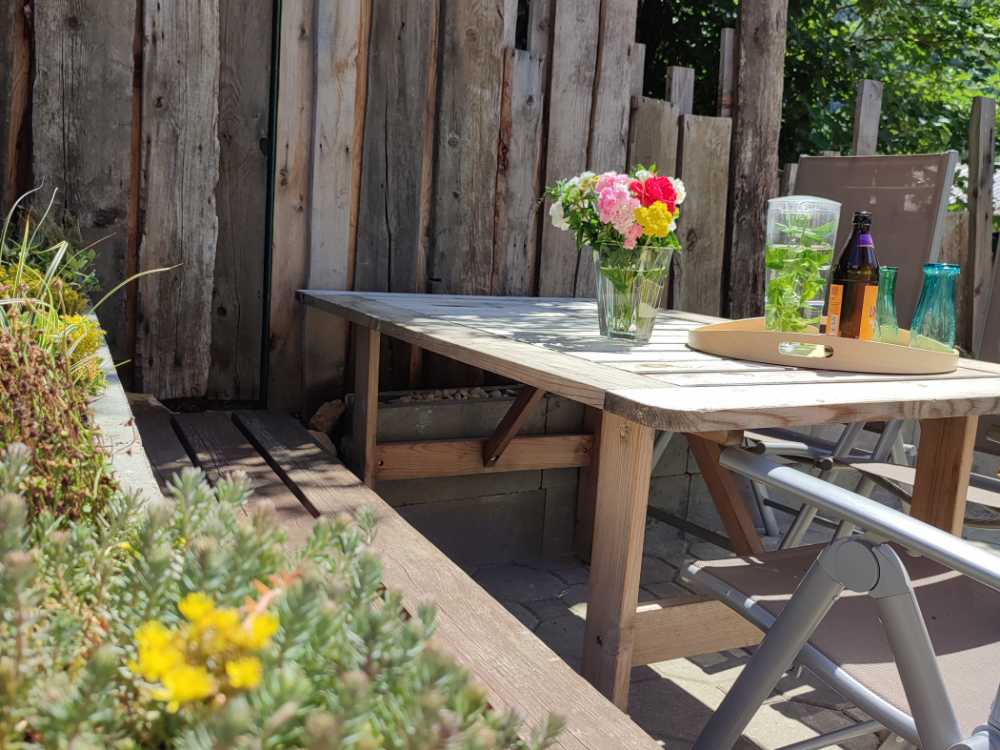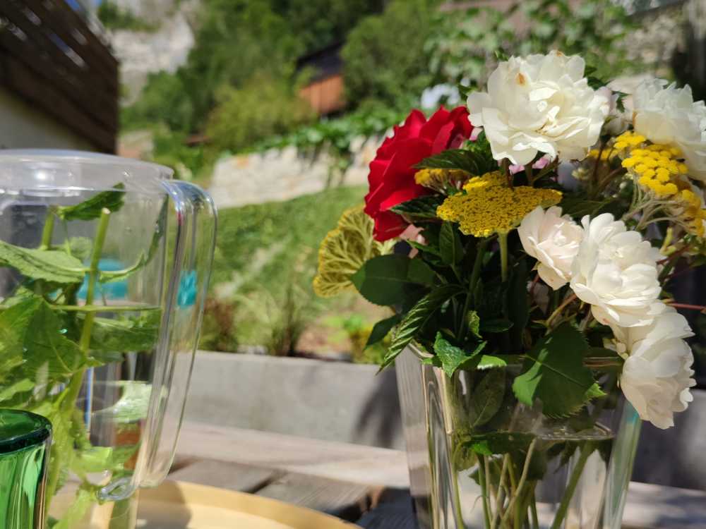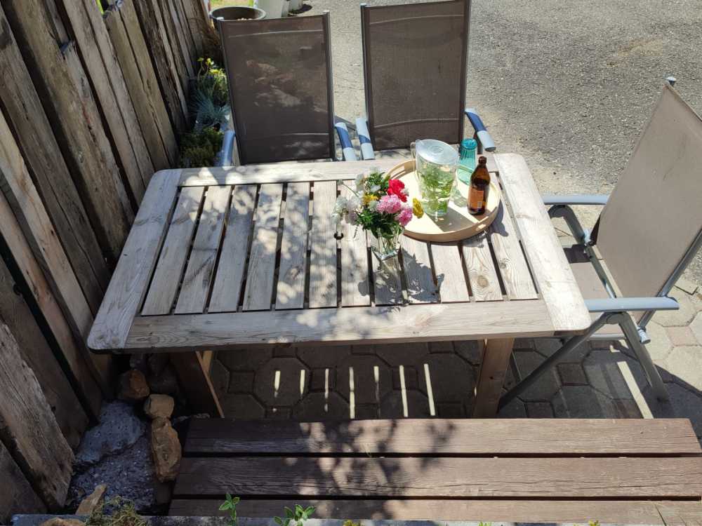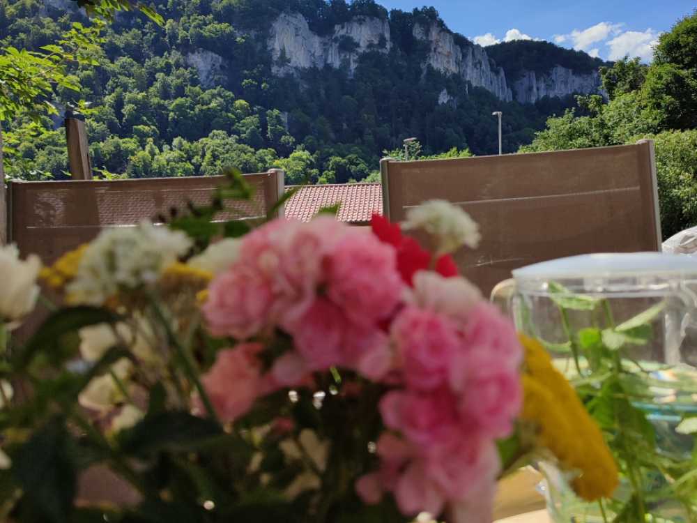 Es gibt die Möglichkeit auf einer kleinen separaten Terrasse draußen zu sitzen, mit Blick auf die Ruine Schloss Hausen und auf die Hausener Felsen. Ein Holzkohlegrill steht ebenfalls zur Verfügung; Holzkohle muss selbst mitgebracht werden.
