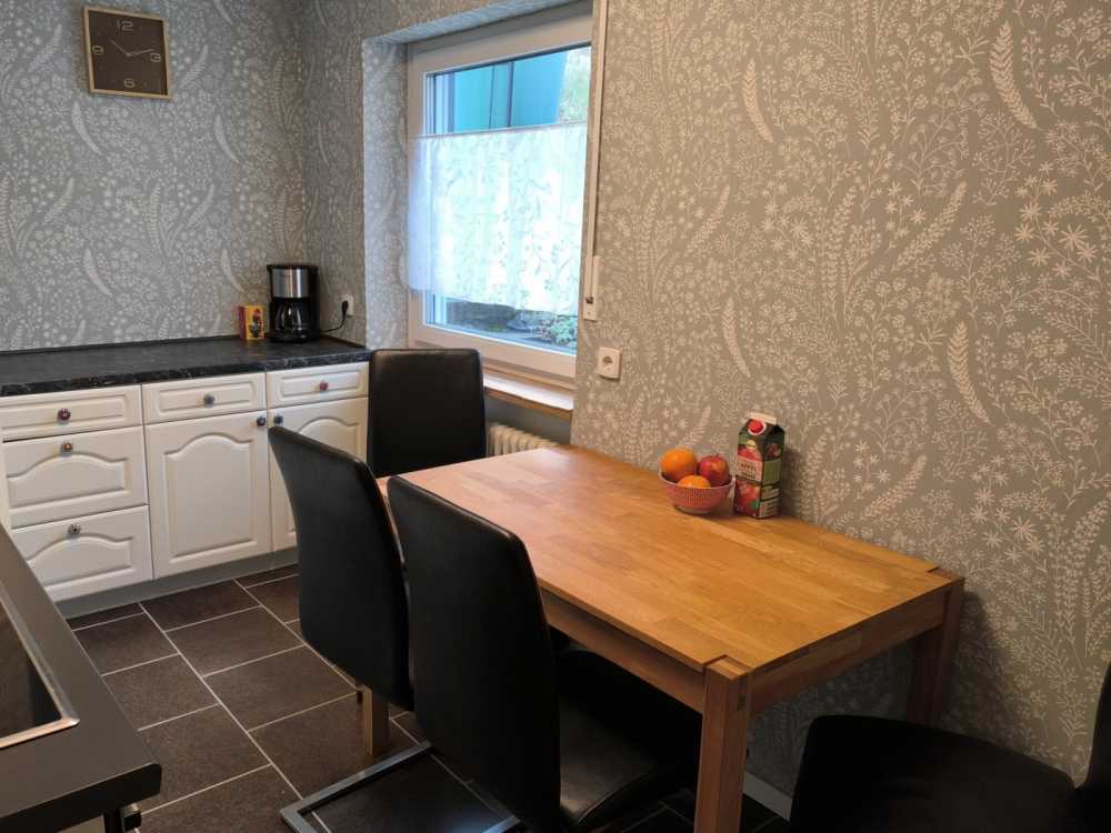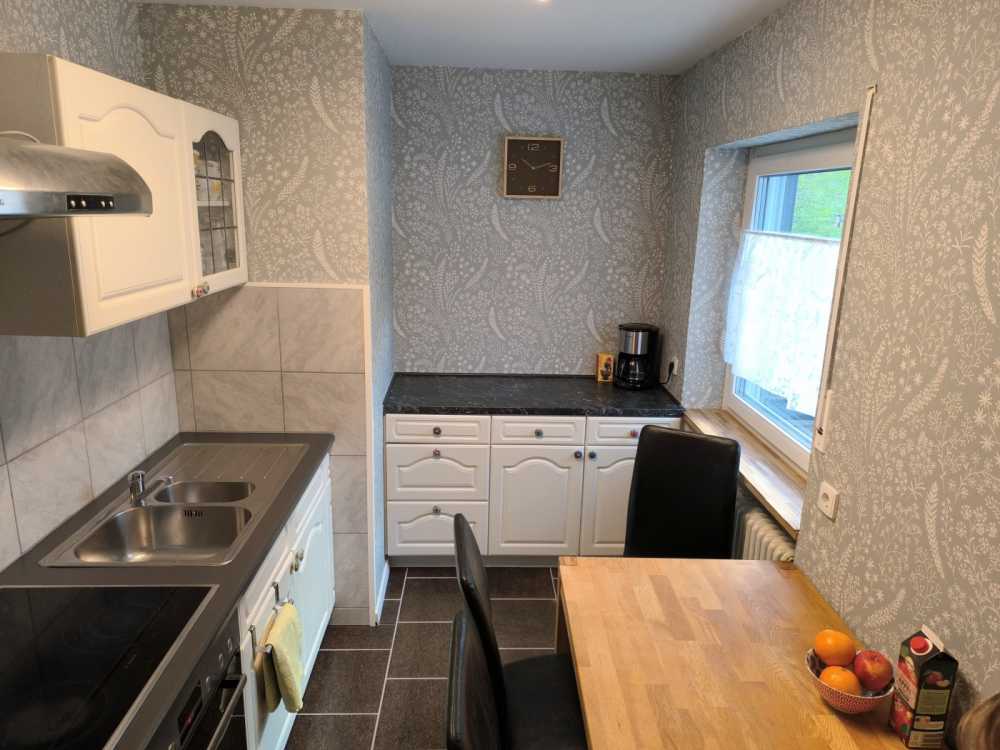 Die Küche ist 4-fach bestuhlt, Kühlschrank mit Gefrierfach, Mikrowelle, Wasserkocher, Filterkaffeemaschine sowie Mini-Padkaffeemaschine, Herd/Backofen und Spüle sowie Grundausstattung Besteck, Geschirr, Töpfe, etc. sind vorhanden.