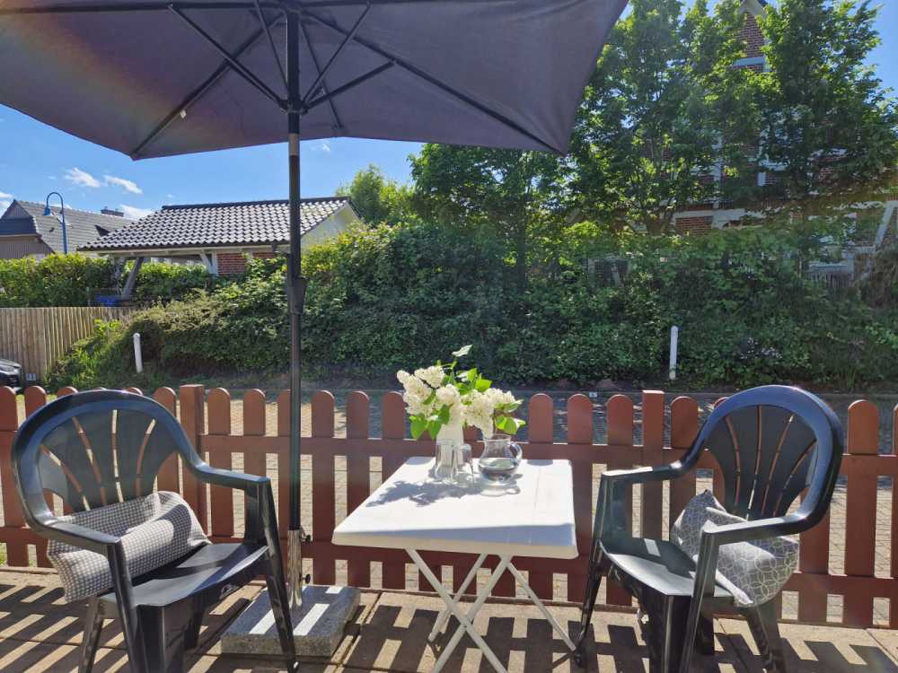 Sonnige Süd-West-Terrasse mit Tisch und Stühlen