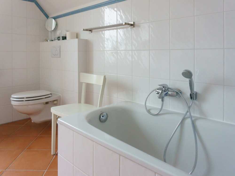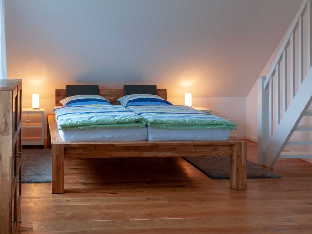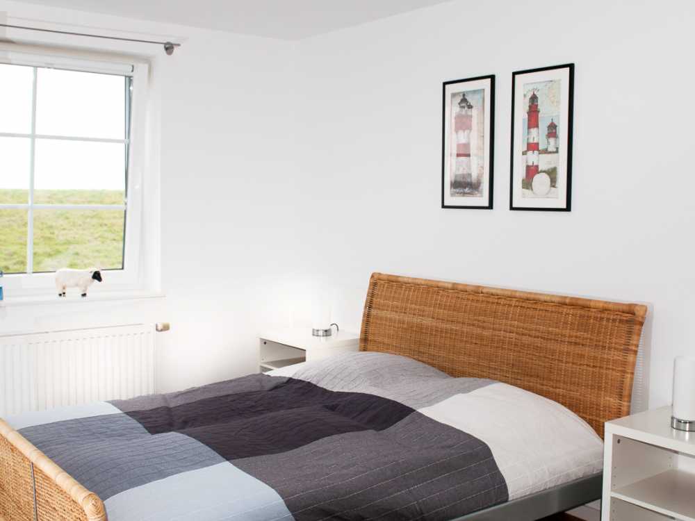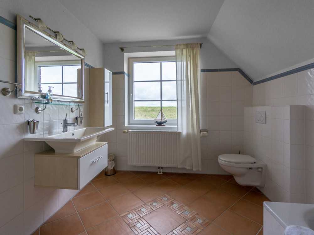Über eine offene Holztreppe gelangen Sie in das mit naturgeölten Landhausdielen ausgelegte Obergeschoss. Dieses beherbergt 2 große Schlafzimmer (mit SAT TV, DVD Player, Rollos und Fenstern mit Insektenschutz für einen ungestörten Schlaf) und das Wohlfühl-Bad, in dem Sie sich in der Badewanne mit Blick auf den Deich entspannen können.