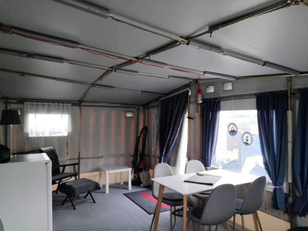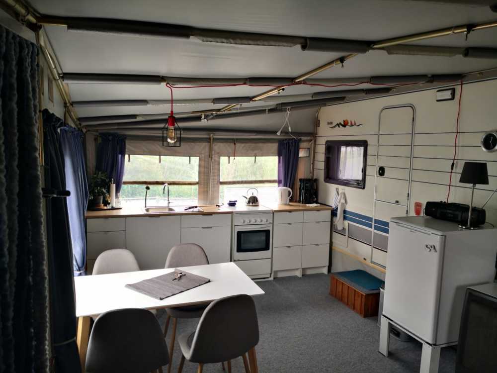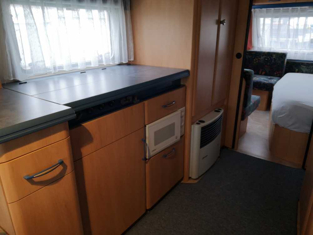 • Ausstattung Vorzelt: neuwertige Küchenzeile mit Festwasseranschluß und Abwasser, Kühlschrank mit Gefrierfach, Gasherd inklusive Backofen, Eßtisch mit 4 Stühlen, eine gemütliche Sitzbank sowie ein weiteres kleines TV-Gerät und ein Gas-Ofen. Die Küche ist mit Kaffeemaschine, Toaster, Sandwichmaker, Wasserkocher, Mixer, Topfset, Back- und Auflaufform sowie genügend Geschirr und Besteck ausgestattet, Staubsauger und Reinigungsmittel sind ebenfalls vorhanden